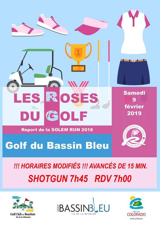 En raison du grand nombre d’inscriptions à la compétition LES ROSES DU GOLF ce samedi 9 février au Golf du Bassin Bleu, - LE RDV EST FIXE À 7:00 AU GOLF DU BASSIN BLEU ! - DÉPART AVANCÉ À 7:45 !!!