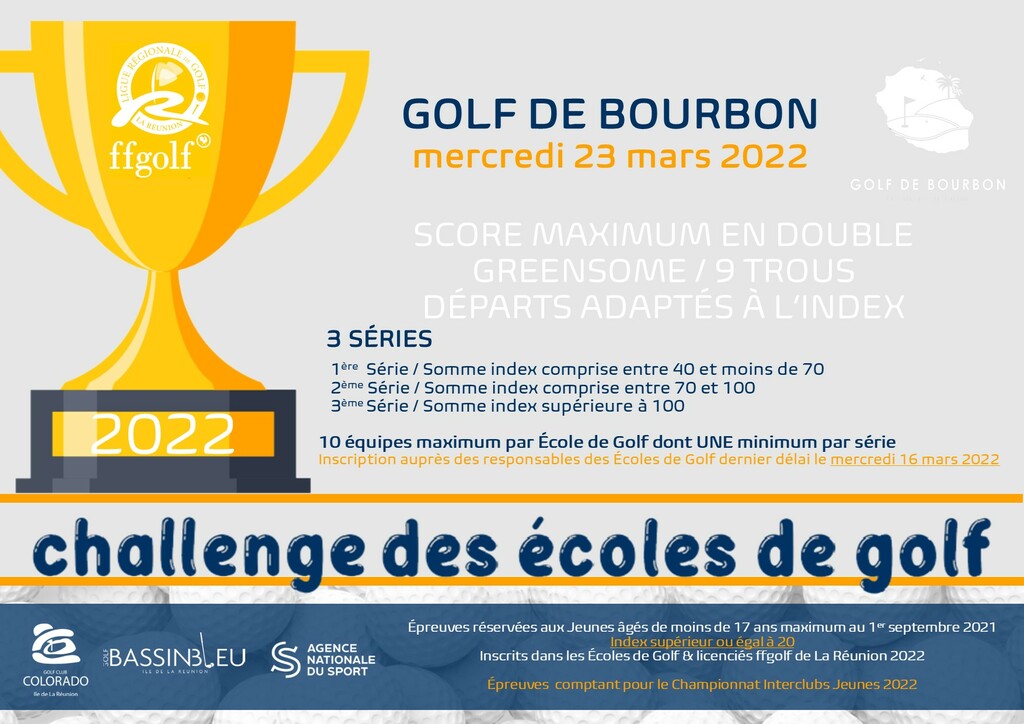Résultats complets Challenge des Écoles de Golf à Bourbon 23 mars 2022 - Classement provisoire Championnat INTERCLUBS JEUNES 2022 à télécharger ICI