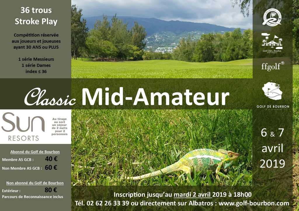 CLASSIC MID-AMATEUR : compétition réservée aux joueuses et joueurs ayant 30 ANS ou plus ! 36 trous Stroke Play ! 1 série Dames / plots bleus !!! 1 série Messieurs / plots blancs !!! Date limite des inscriptions : MARDI 2 AVRIL 2019 à 18h00 via Albatros ou par téléphone au 0262 26 33 39 !