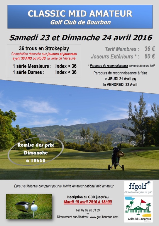 Les 23 et 24 avril, vous pourrez participer au Classic Mid Amateur sur le parcours du Golf Club de Bourbon. Condition : être âgé de plus de 30 ans.