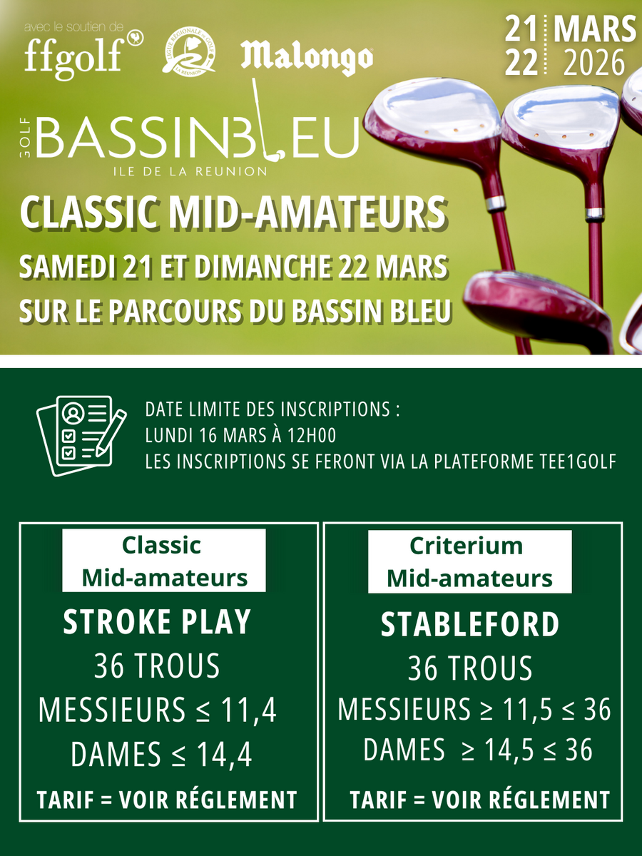 Pour vous inscrire au Classic Mid-Amateurs https://www.tee1golf.com/connexion.php?idc=10228&u=classic-mid-am-21-03-2026-golf-du-bassin-bleu