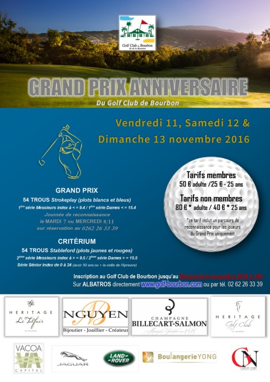 Le Grand Prix du Golf Club de Bourbon se déroulera sur 54 trous du 11 au 13 novembre sur notre parcours. Il s'agit aussi de la dernière épreuve du Championnat de la Réunion.