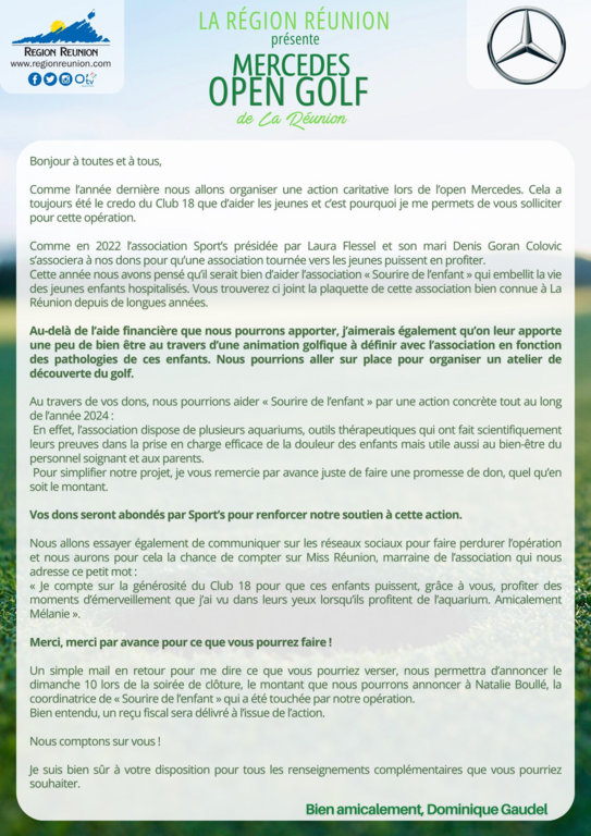 Ci-dessous les éléments de l’opération caritative "SOURIRE DE L'ENFANT" organisée lors du Mercedes Open Golf de La Réunion. Merci de ce que vous pourrez faire, nous comptons sur vous !