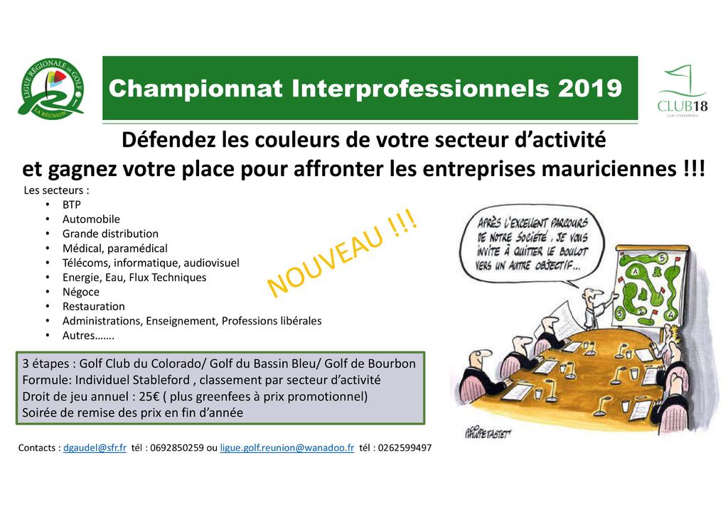 Nouveauté 2019 !!! La Ligue Régionale de Golf de La Réunion organise le CHAMPIONNAT INTERPROFESSIONNELS !!! Défendez les couleurs de votre secteur d’activité et gagnez votre place pour affronter les entreprises mauriciennes !!!