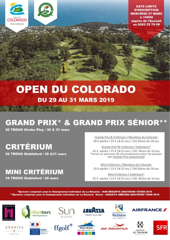 Open du Colorado, tournoi ouvert aux joueurs licenciés de la FFGolf dans la limite des places disponibles. Les index pris en compte seront ceux donnés par RMS à la date de clôture des inscriptions. Chaque joueur doit être à jour de son certificat médical de non contre-indication à la pratique du golf en compétition avant la clôture des inscriptions, soit le Mercredi 27 mars 2019 avant 15h00 !!!
