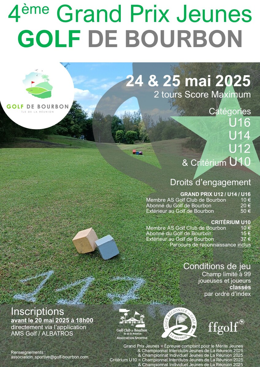 Le champ total des joueurs et joueuses licenciés ffgolf 2025 & CLASSÉS sera limité à 75 pour le GRAND PRIX JEUNES dont 30 garçons minimum,9 filles minimum et 24 places pour le CRITÉRIUM U10 (Filles & Garçons).