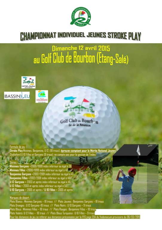 Le Championnat Individuel Jeunes Stroke Play 2015 se déroulera le dimanche 12 avril 2015 au Golf Club de Bourbon, épreuve comptant pour le Mérite National Jeunes.
