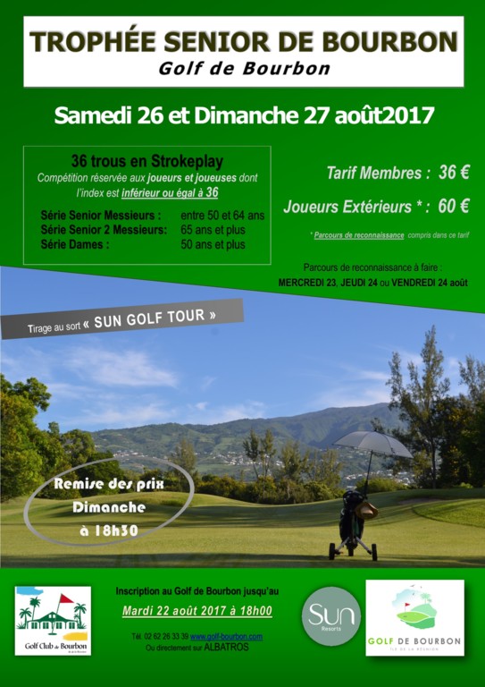 Le Golf Club de Bourbon organisera le week-end des 26 et 27 août prochain le Trophée SENIOR. C'est une épreuve fédérale ouverte aux DAMES et aux MESSIEURS ayant 50 ans ou plus et dont l'index ne dépasse pas 36. Il y a une série de 65 ans + pour les Sénior 2 Messieurs. Inscription au Golf Club de Bourbon jusqu'au mardi 22 août à 18h00 !