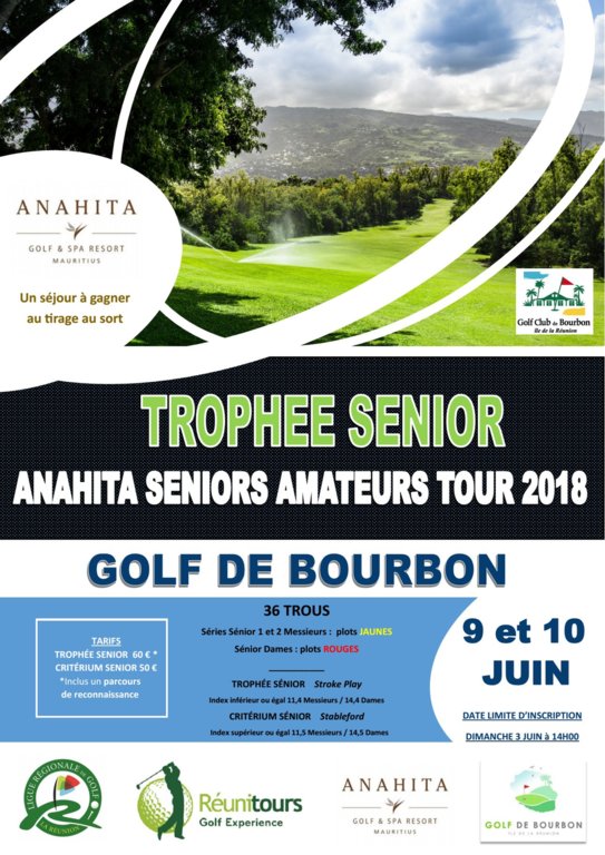 La deuxième étape du " Trophée Sénior 2018 " - comptant pour le Championnat Individuel de La Réunion Sénior / Anahita Séniors Amateurs Tour - se tiendra les samedi 9 et 10 juin au Golf de Bourbon !