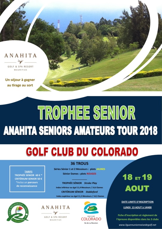 La dernière étape du " Trophée Sénior 2018 " - comptant pour le Championnat Individuel de La Réunion Sénior / Anahita Séniors Amateurs Tour - se tiendra les samedi 18 et dimanche 19 août au Golf Club du Colorado !
